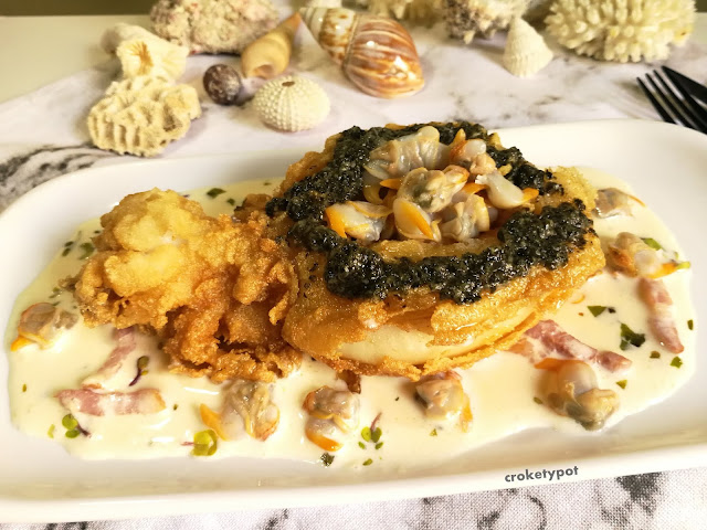 En el plato pondremos la salsa carbonara, la sepia frita, adornamos con el alioli de alga nori y completamos con los berberechos.